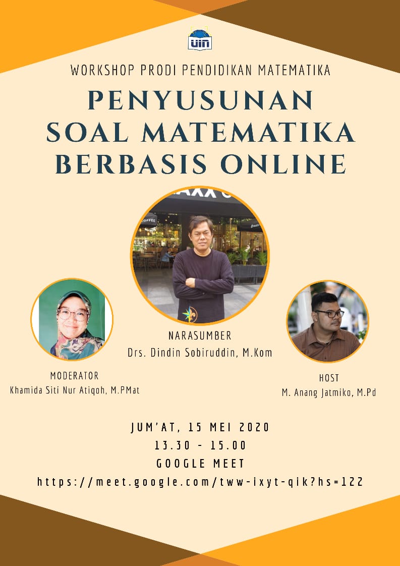 Kegiatan Workshop Penyusunan Soal Matematika Berbasis Online ini diadakan oleh prodi Pendidikan Matematika FITK pada hari Jum’at tanggal 15 Mei 2020 secara online. Narasumber pada acara workshop ini adalah Drs. Dindin Sobiruddin, M.Kom. dengan moderator Khamida Siti Nur Atiqoh, M.PMat. Tujuan diadakannya Kegiatan workshop ini untuk mendukung proses perkuliahan jarak jauh pada semester genap tahun ajaran 2019/2020 akibat dari pandemi Corona-19.